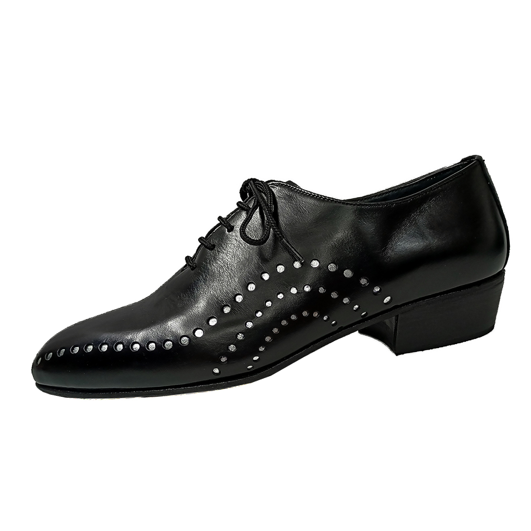 Combinado en cuero negro con detalles de puntos en cuero plata, suela de cromo, taco frances