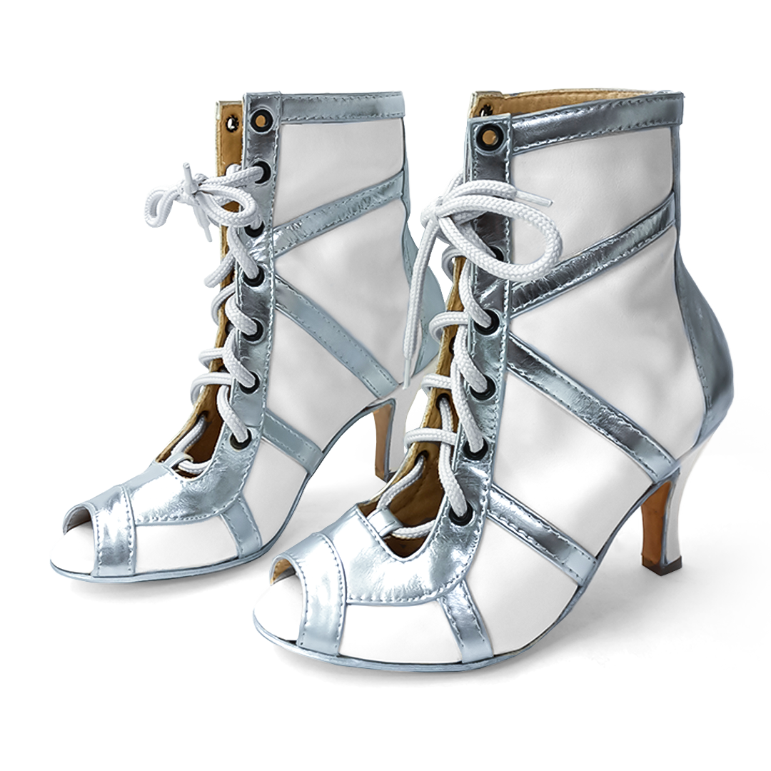 Botas con punta abierta. Combinada en cuero blanco y plata. Media suela de cromo. Taco 7 cm