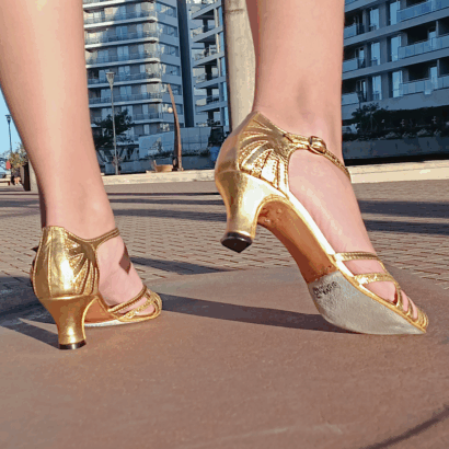Combinada en cuero metalizado oro y lame al tono. Suela de cromo. Taco 4.5cm